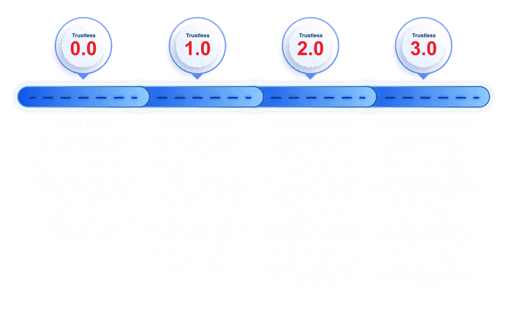 • Cyber Resilience Maturity Assessment: Assesses the organization's position on the Trustless Maturity Matrix (0.0 – 3.0).
